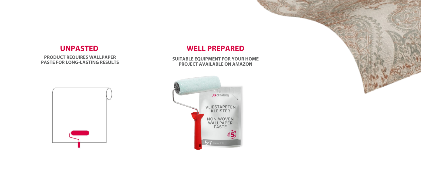 Discover our wide range of high-quality wallpaper designs and wallpapering tools, which are manufactured exclusively in Germany with the highest quality standards. Our wallpapers must be applied to the wall using paste.