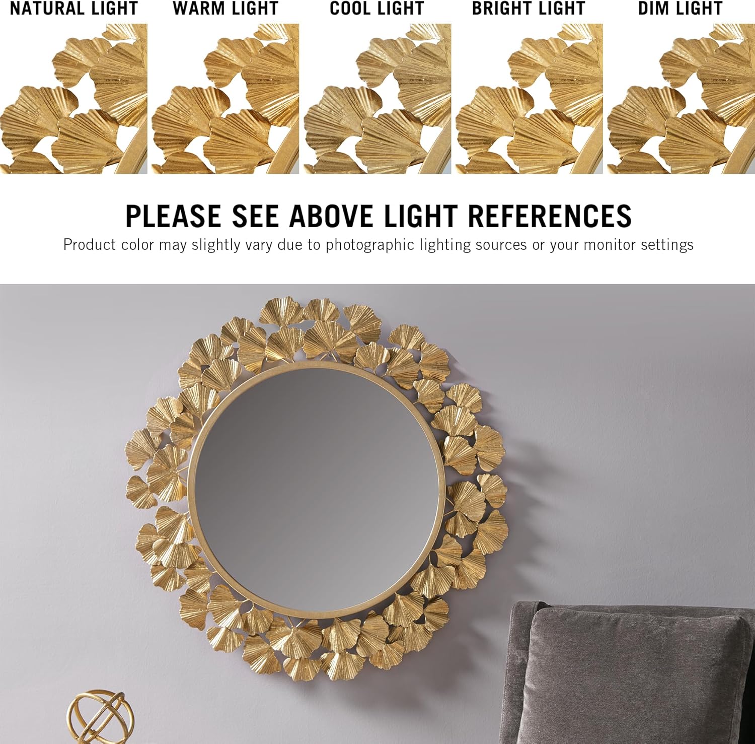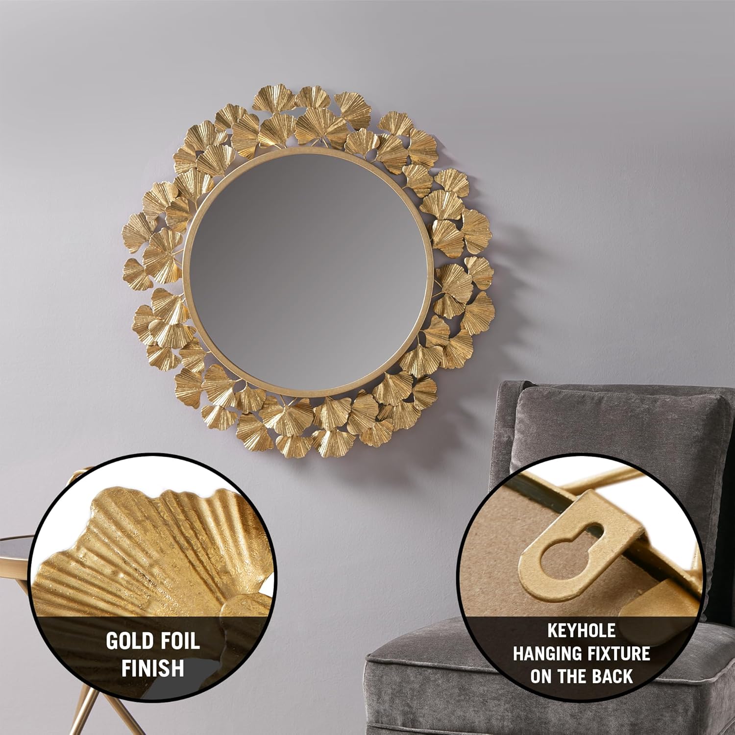 Martha Stewart Wall Décor Large Gingko Leaf Round Wall Mirror for Living Room, Iron Metal Plate Frame Antique Finish, Ready to Hang Bedroom Decoration, Eden, 30.5", Gold