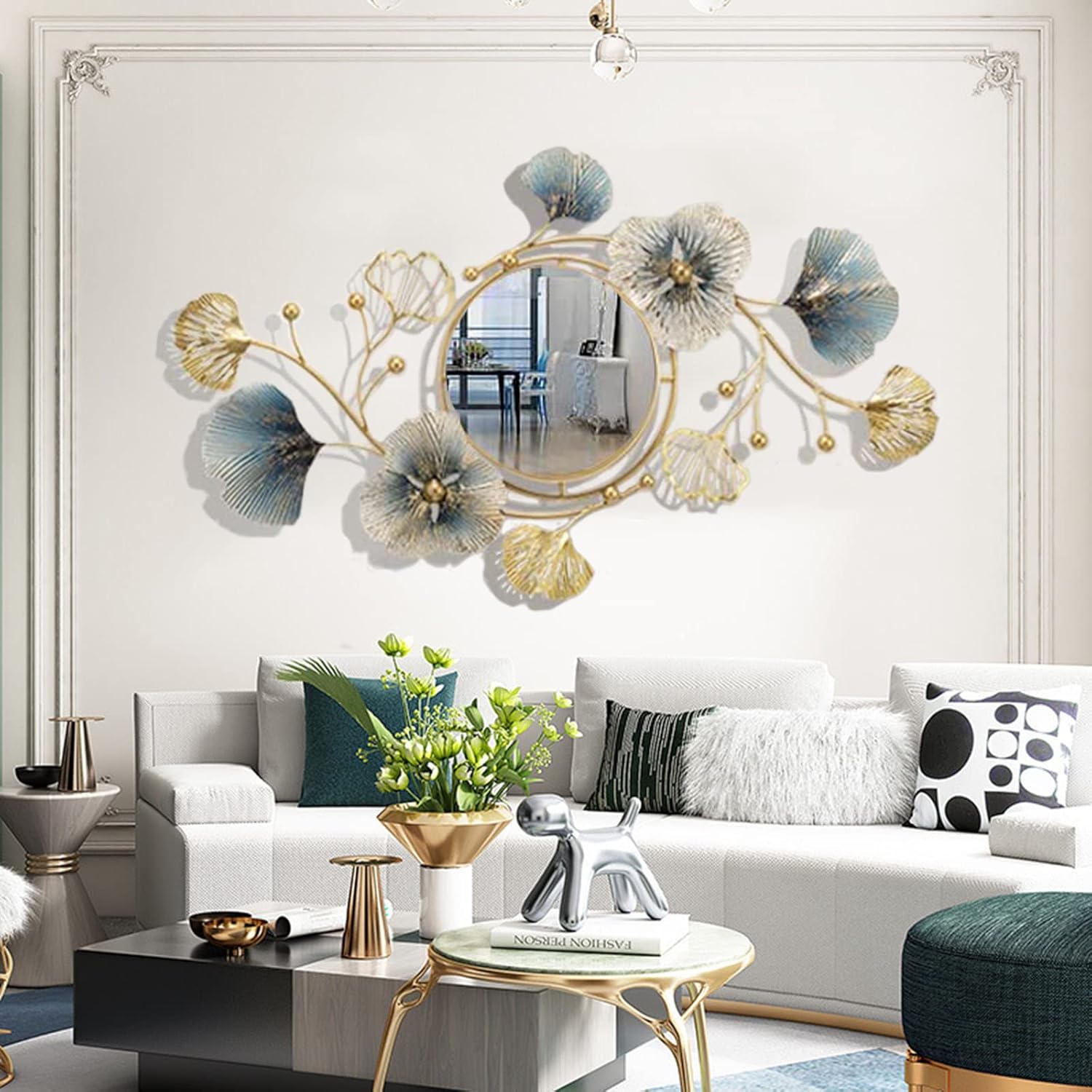 The Ginkgo Leaf Mirror Wall Decor, a perfect choice for adding a touch of elegance to your home. This exquisite piece features a circular mirror at its center, surrounded by intricately crafted iron in shades of gold and light blue. Resembling the delicate leaves of a ginkgo tree. With dimensions of 118x68cm (47x27 inches), it brings a remarkable decorative impact to any space.